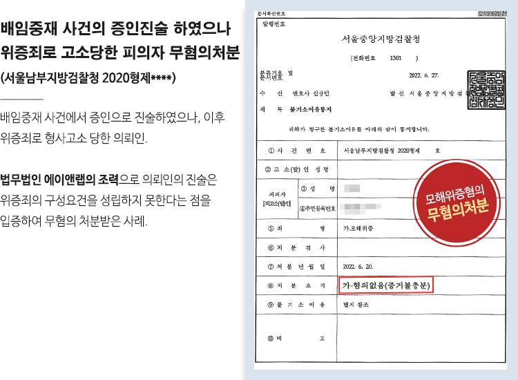 모해위증죄로 고소당한 피의자 변호하여 전부 무혐의 결정