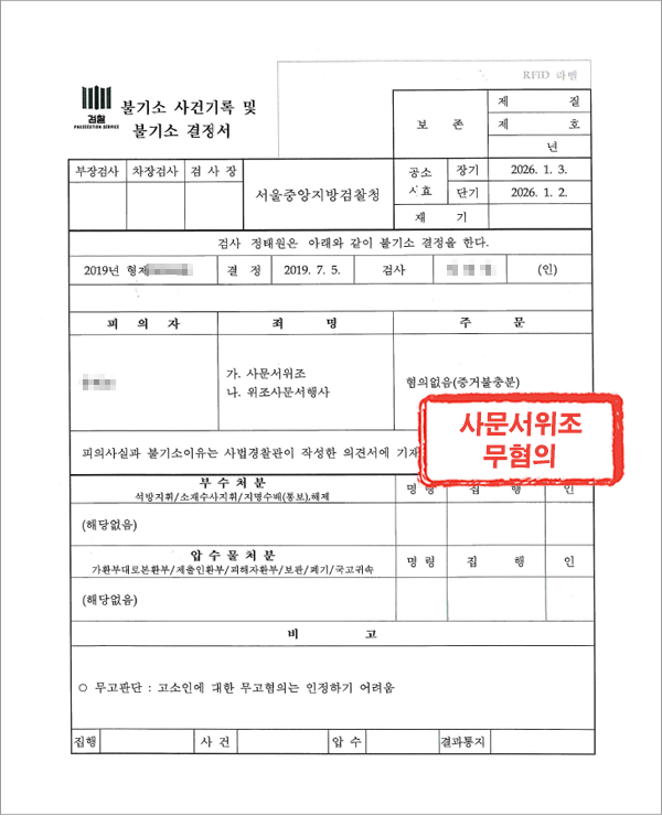 그 결과 검찰에서는 의뢰인에 대해 혐의없음의 불기소처분(증거불충분)을 하였습니다.