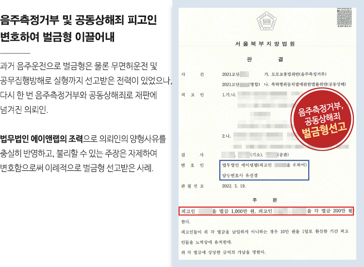 음주측정거부 및 공동상해죄 피고인 변호하여 벌금형 이끌어내