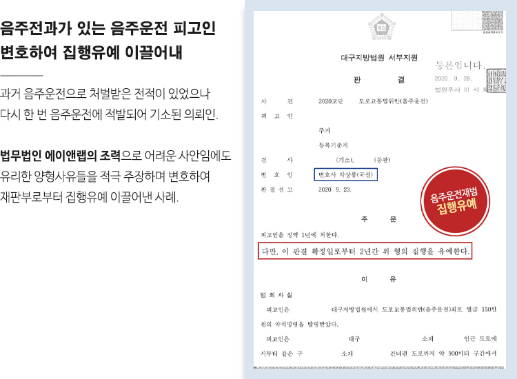 이에 재판부는 박상룡 변호사가 주장한 양형사유들을 반영하여 음주 재범사건에서 드물게 집행유예 판결을 내렸습니다.