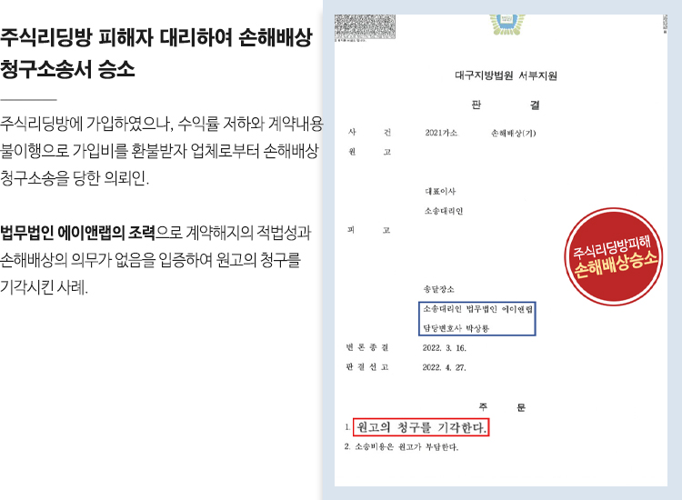 주식리딩방 피해자 대리하여 손해배상 청구 사건서 승소
