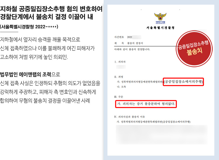 지하철 공중밀집장소추행 혐의 피의자 변호하여 경찰단계에서 불송치 결정 이끌어 내