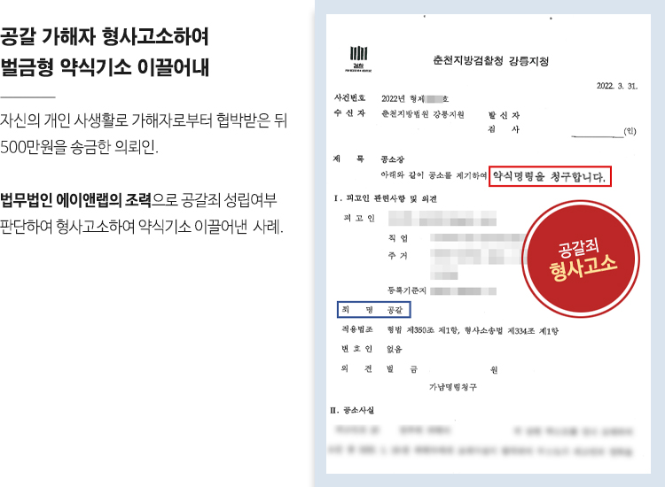 500만원 피해 발생한 공갈 가해자 고소하여 약식기소 이끌어내